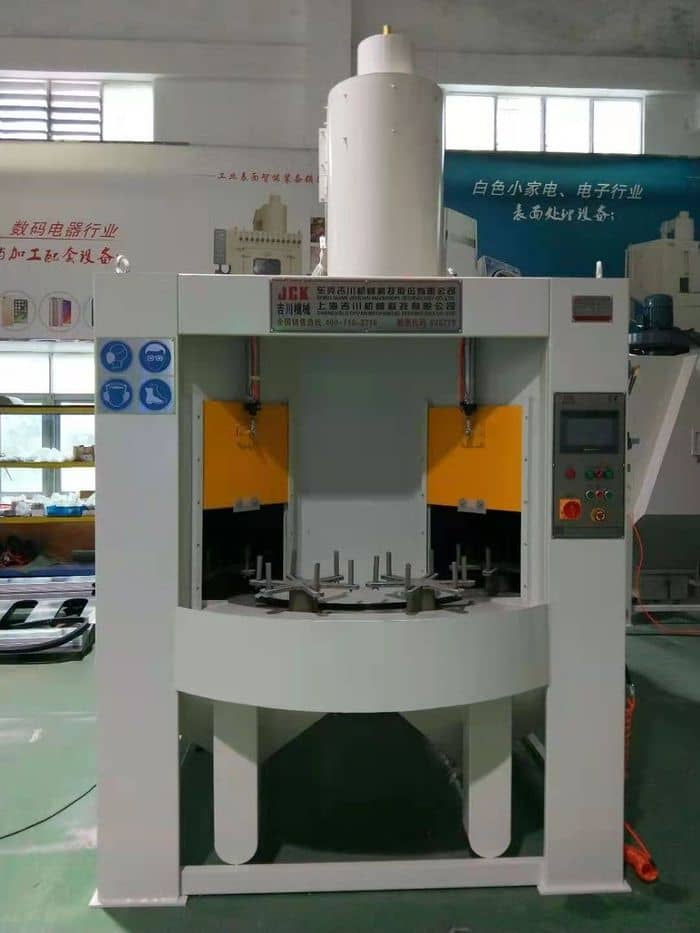本设备是根据我公司针对各类产品和处理要求而专门设计的转盘式自动喷砂机,完全适合贵公司所提供的产品。根据贵公司对产品效率的要求,本机共大转盘共设置4个区域(90度一个区域),每个区域设置3个工件装夹工位。大转盘每转动90度区域一停,喷砂区域内共布置9支普压高速喷砂枪,在喷砂区1个区域 3个喷砂加工位,各布置3支喷砂枪对工件需喷砂部位做自动喷砂加工,喷枪可根据加工需要,随意调整其喷射角度,其自动化程度较高。